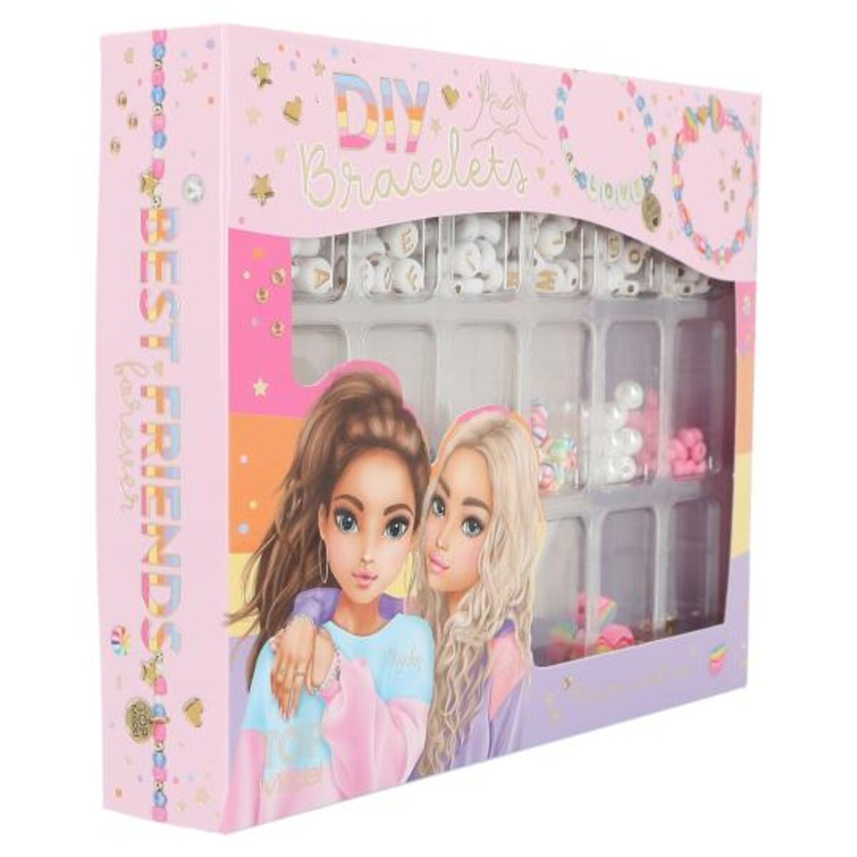 Jede Menge Perlen für jede Menge Kreativität: weiß-goldene Buchstabenperlen, matt-weiße Glasperlen, regenbogenbunte Clay-Perlen, hellblaue Diamant-Perlen, kleine goldene Perlen, rosafarbene Glasperlen, schimmernd-weiße Perlen sowie 6 goldene Metall-Anhänger (2x TOPModel-Logo, 2x Herz, 2x Stern). Zusammen mit dem elastischen Band (2 m) und der beiliegenden Anleitung für den richtigen Knoten lassen sich angesagte Armbänder kreieren. Von TOPModel.