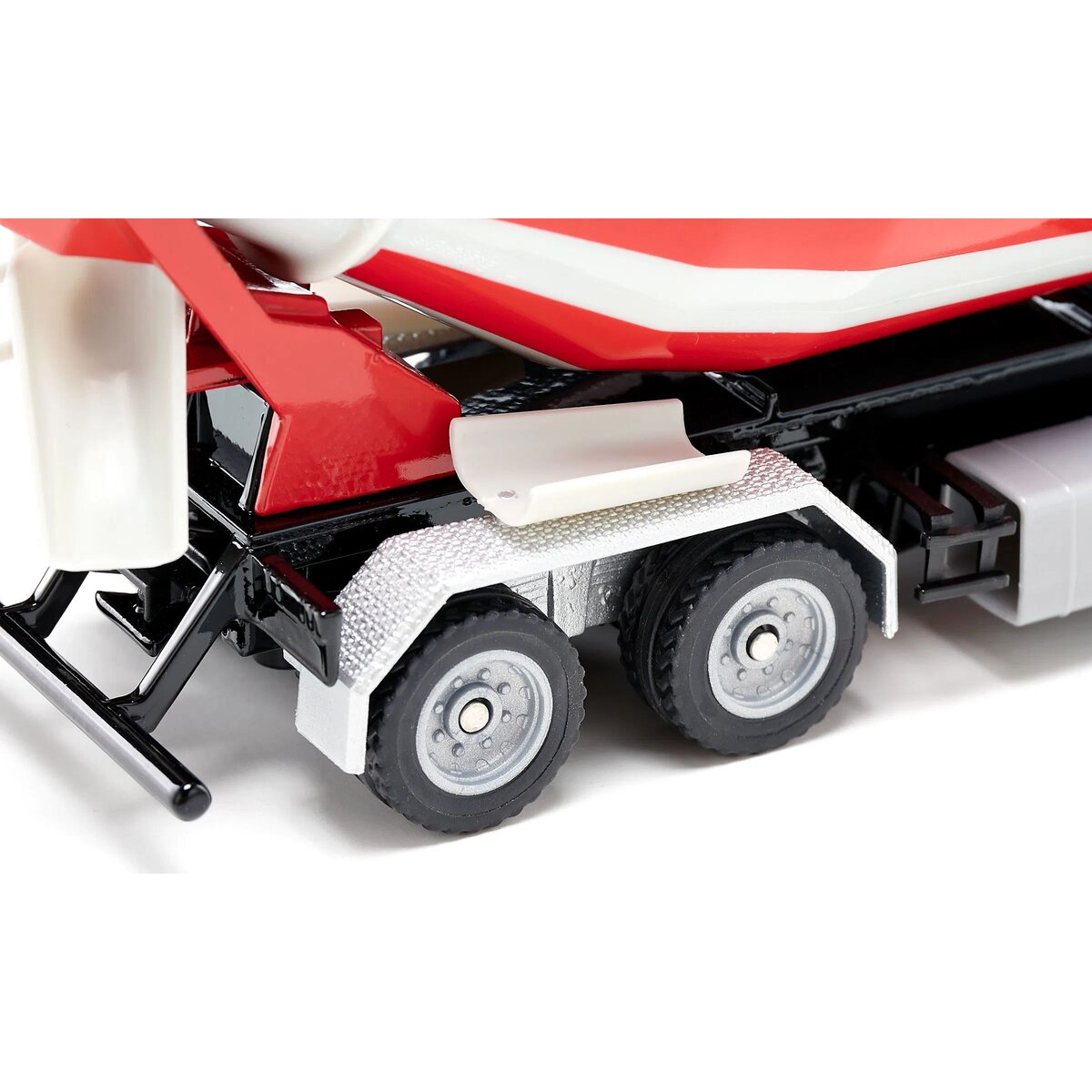 Transportbeton an die Baustelle zu bringen ist Aufgabe des Fahrmischers. Das 1:50 Modell mit Liebherr Aufbau auf einem 3-Achs-Fahrgestell mit Mercedes-Actros-Fahrerhaus wird dieser Aufgabe mühelos gerecht. Die Trommel ist drehbar und mit einem markanten rote-weißen Streifendesign bedruckt. Der Ausguss ist drehbar und durch zwei mitgelieferte Bauteile verlängerbar.