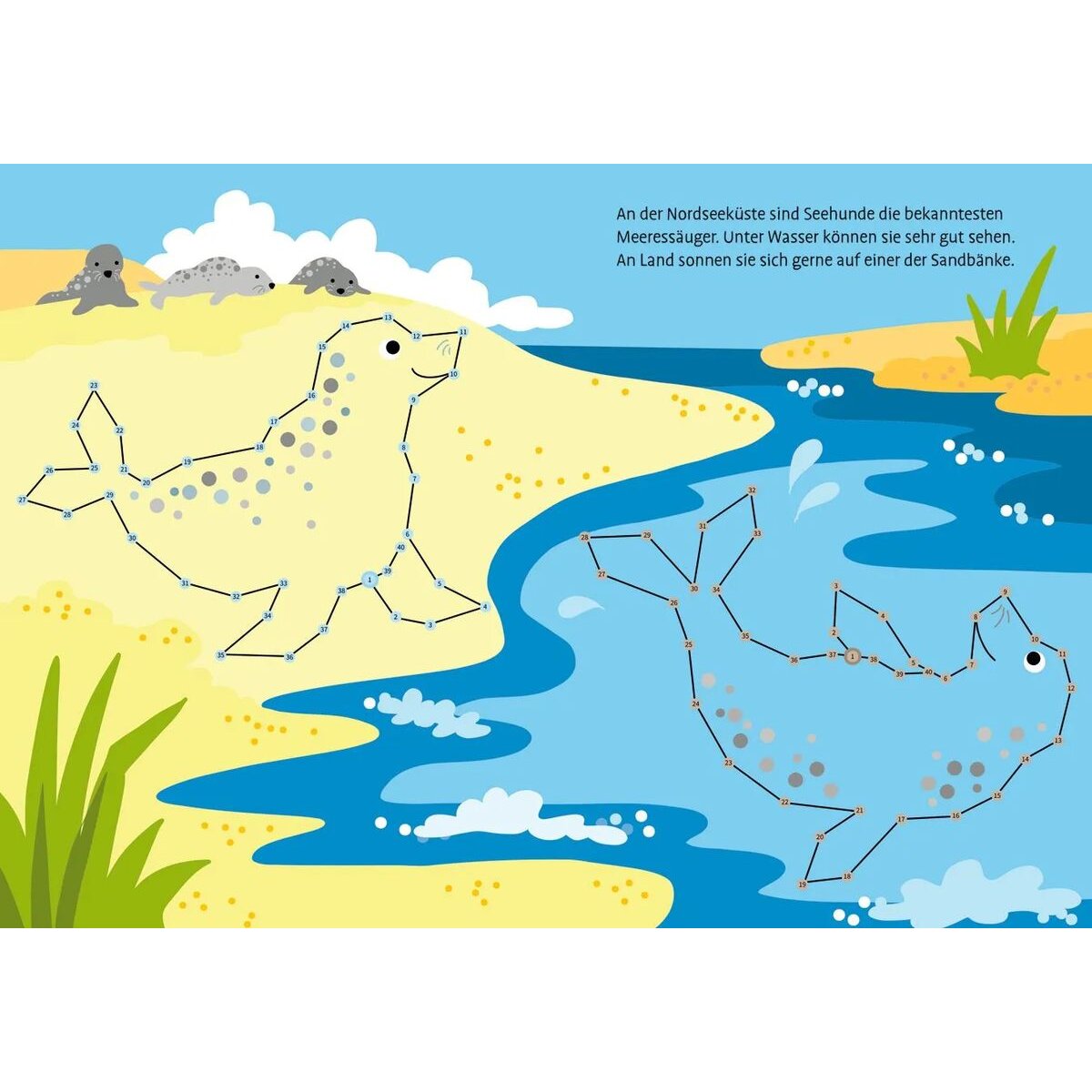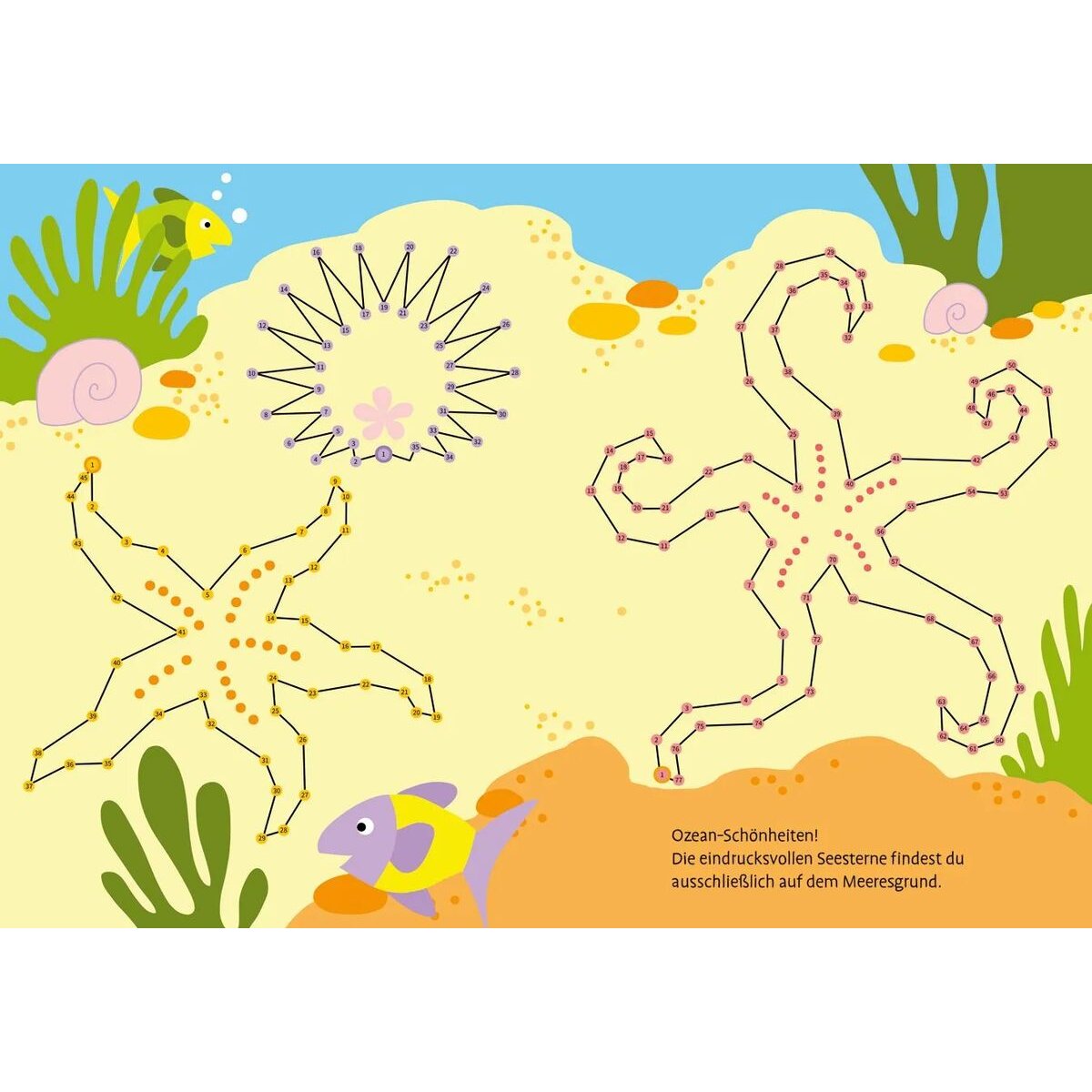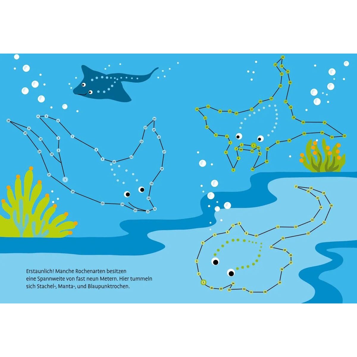 Wow! Viele bunte Fische, Wale und Delfine tummeln sich im Meer. Die fröhlichen Szenen können mit Hilfe der Zahlen von 1 bis höchstens 100 vervollständigt werden. Punkt zu Punkt kreieren Kinder ab 7 Jahren tolle Motive aus der Welt unter Wasser. Kurze ergänzende Texte vermitteln Wissenswertes und Unterhaltsames aus dem Leben der Tiere. So macht das Malen noch mehr Spaß!
